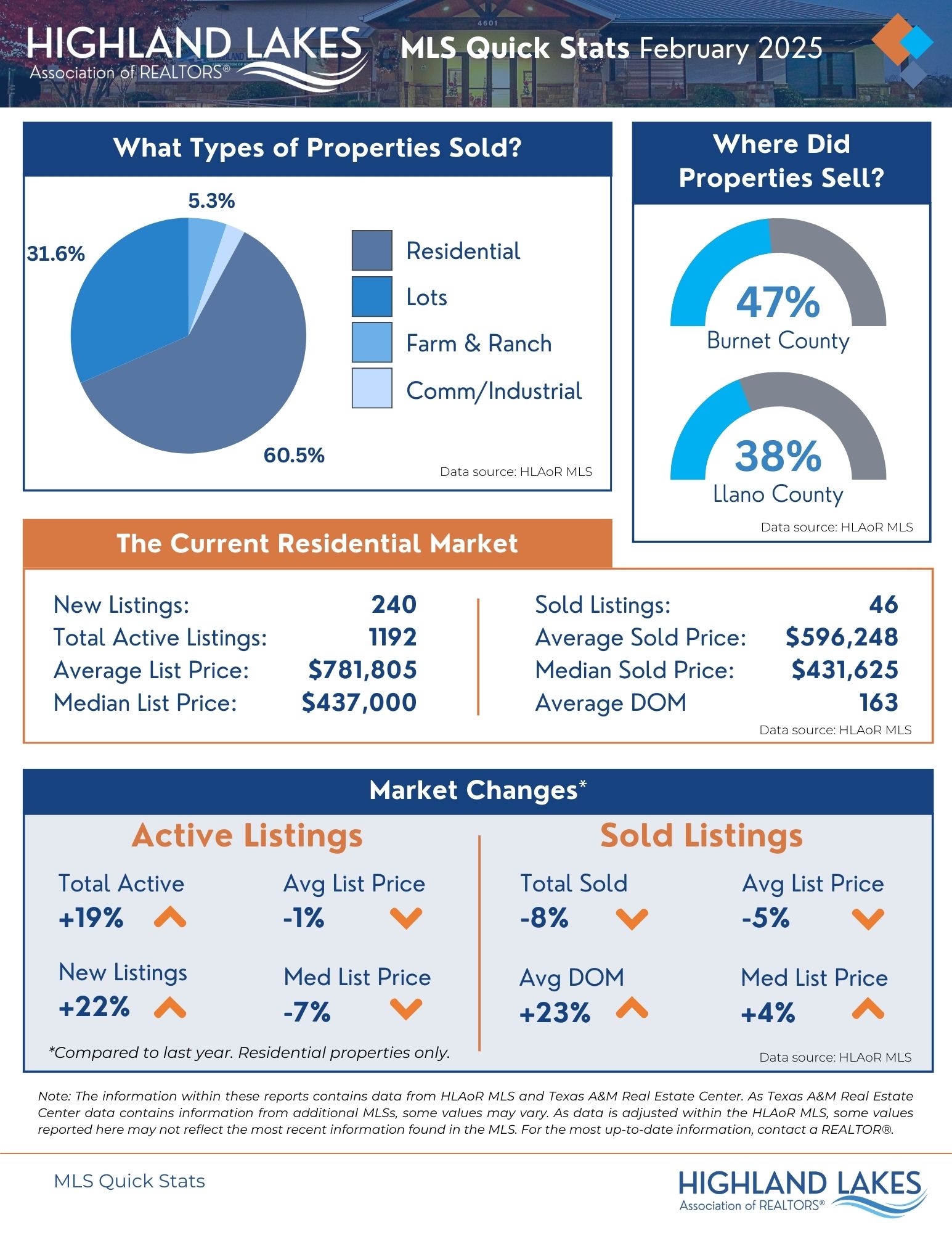 Nuestros participantes y suscriptores del MLS tienen acceso a un informe de 9 páginas, así como a infografías del Centro de Investigación Inmobiliaria de Texas A&M (TRERC). Estos recursos incluyen datos del MLS de Texas que publicaron o vendieron propiedades en los condados de Burnet y Llano. Los informes incluyen datos por condado y ciudad dentro de los condados de Burnet y Llano.